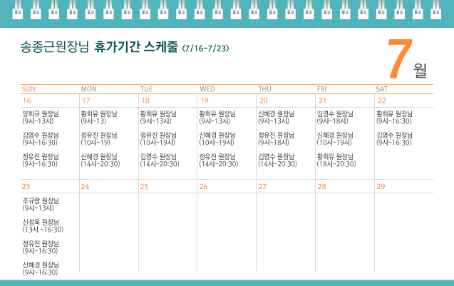 송종근원장님 휴가기간 중 의료진 진료일정표