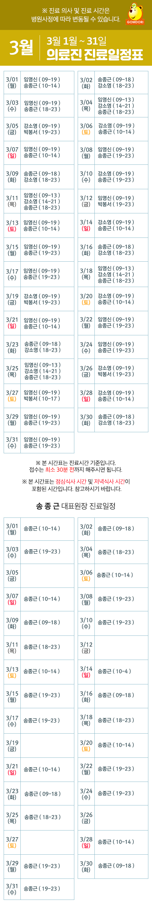 3월 의료진 및 송종근 대표원장 진료일정표