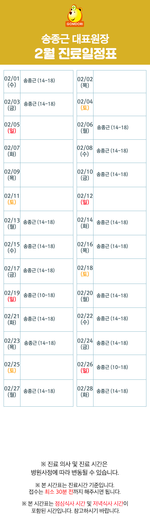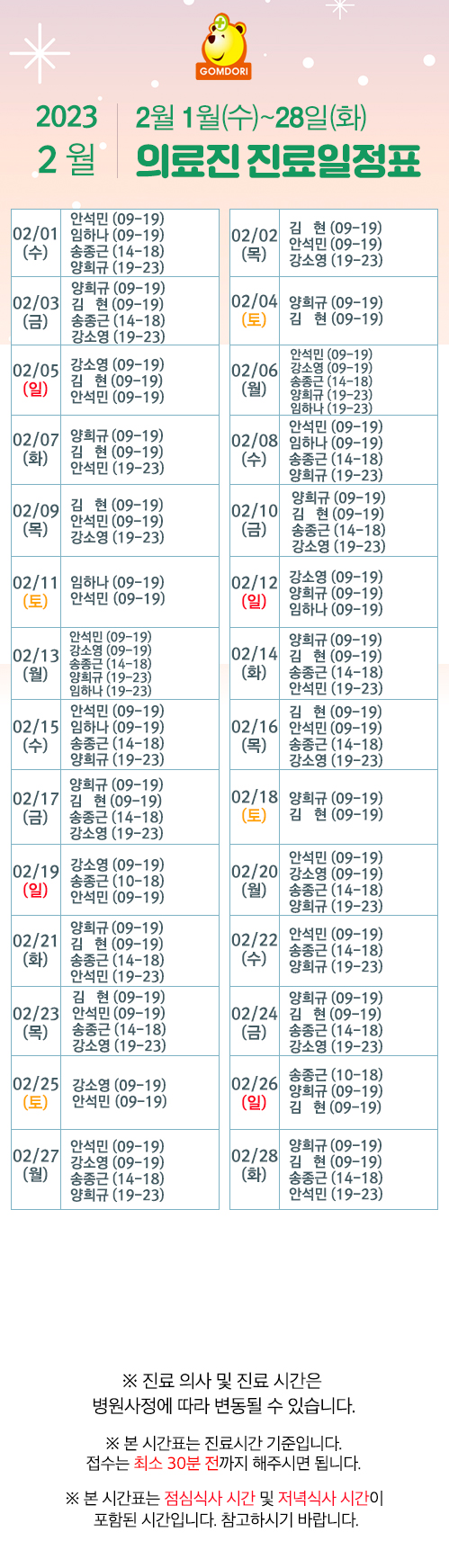 ※ 진료 의사 및 진료 시간은 병원사정에 따라 변동될 수 있습니다.