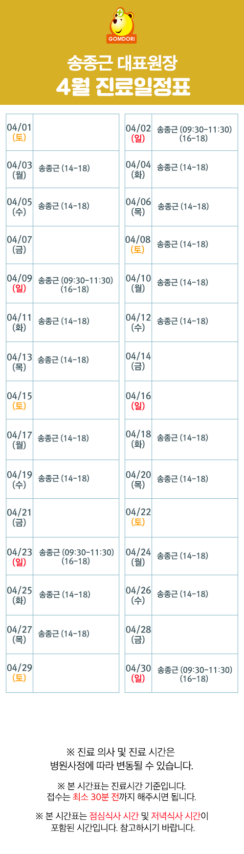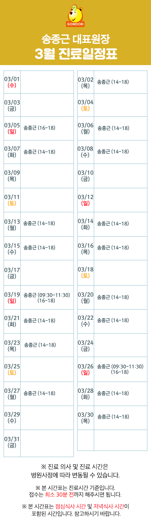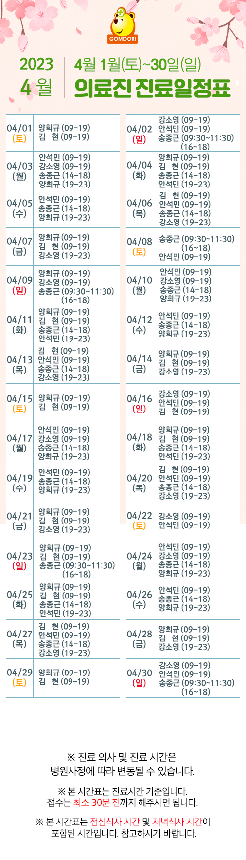 ※ 진료 의사 및 진료 시간은 병원사정에 따라 변동될 수 있습니다.