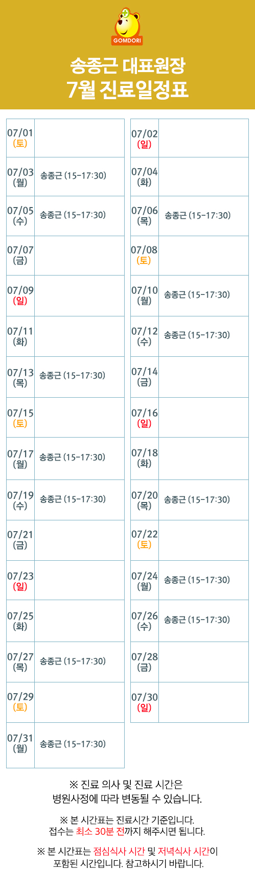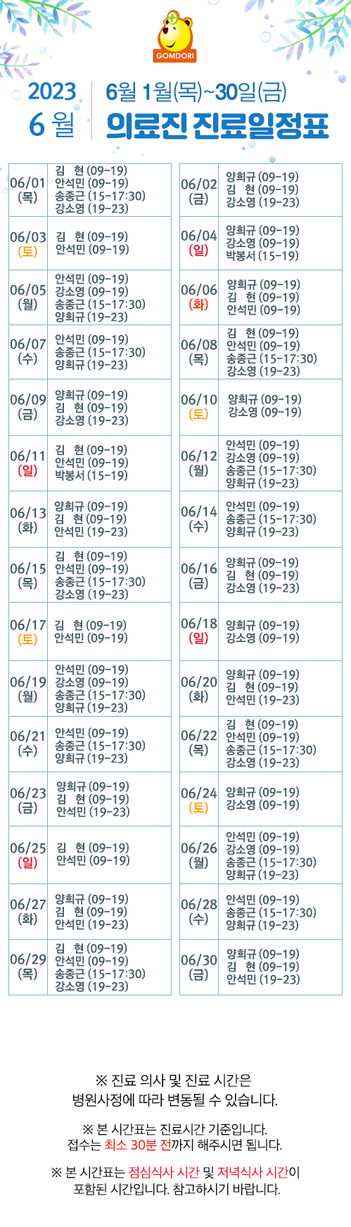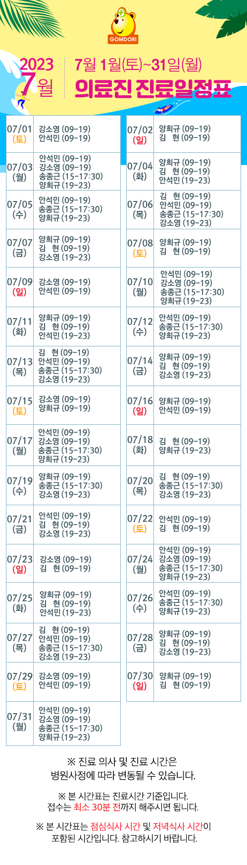 ※ 진료 의사 및 진료 시간은 병원사정에 따라 변동될 수 있습니다.