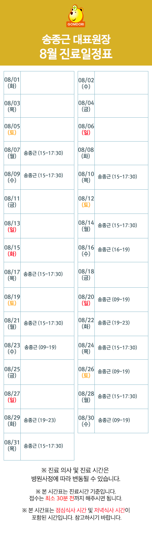 ※ 진료 의사 및 진료 시간은 병원사정에 따라 변동될 수 있습니다.