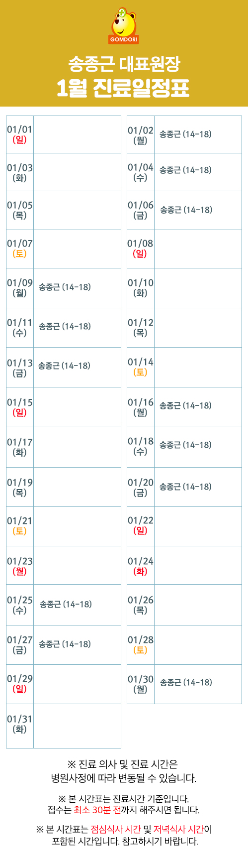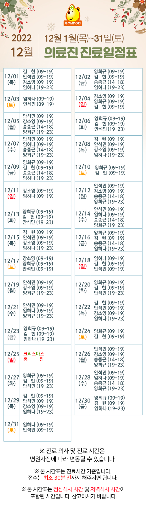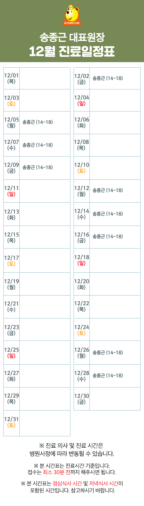 12월 의료진 및 송종근 대표원장 진료일정표