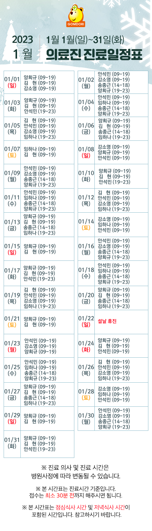 ※ 진료 의사 및 진료 시간은 병원사정에 따라 변동될 수 있습니다.