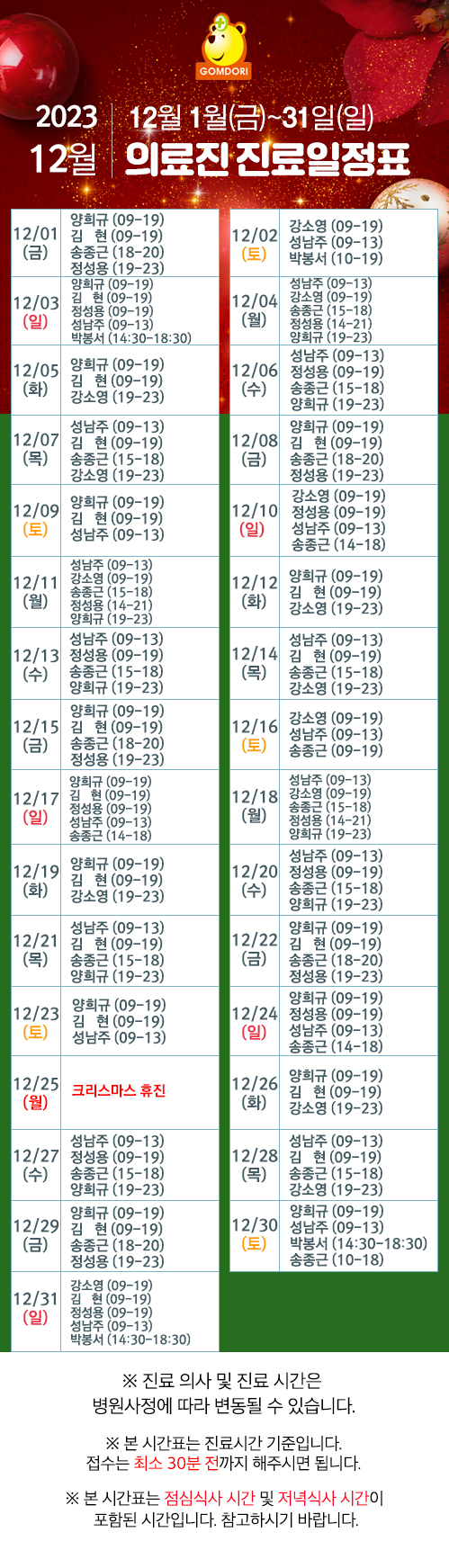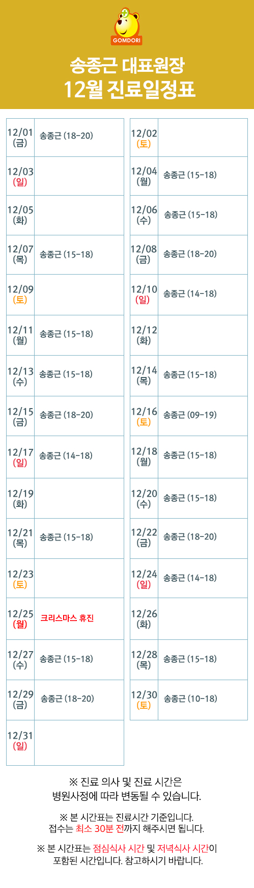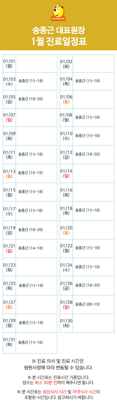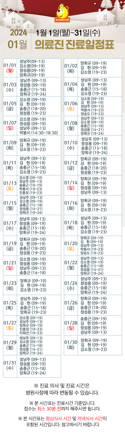 ※ 진료 의사 및 진료 시간은 병원사정에 따라 변동될 수 있습니다.