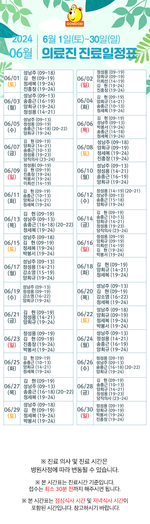 ※ 진료 의사 및 진료 시간은 병원사정에 따라 변동될 수 있습니다.