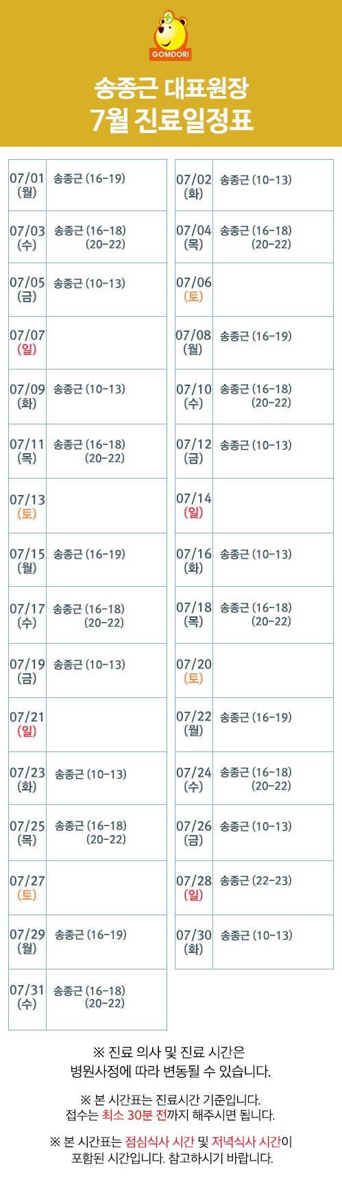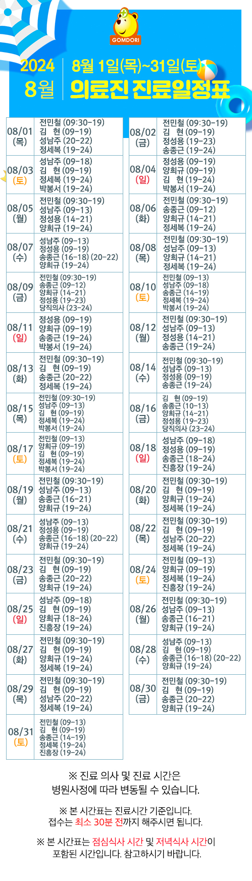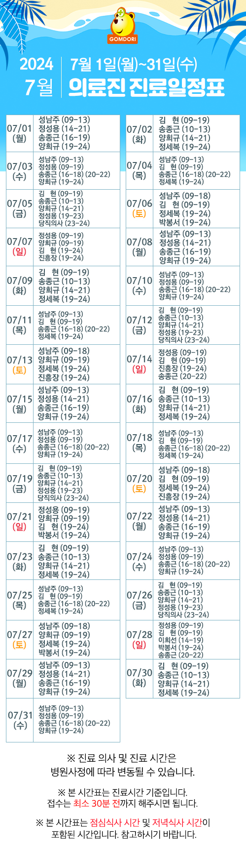 ※ 진료 의사 및 진료 시간은 병원사정에 따라 변동될 수 있습니다.
