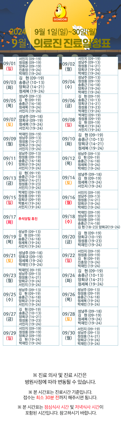 9월 의료진 및 송종근 대표원장 진료일정표