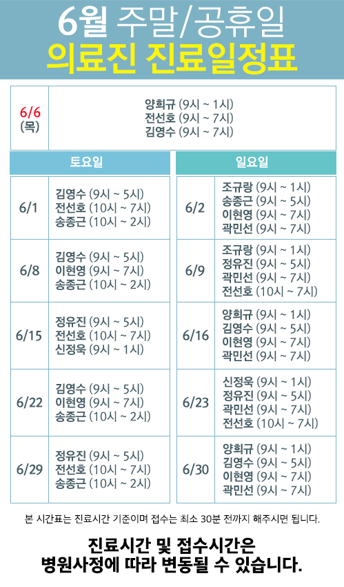 ※ 진료 의사 및 진료 시간은 병원사정에 따라 변동될 수 있습니다.