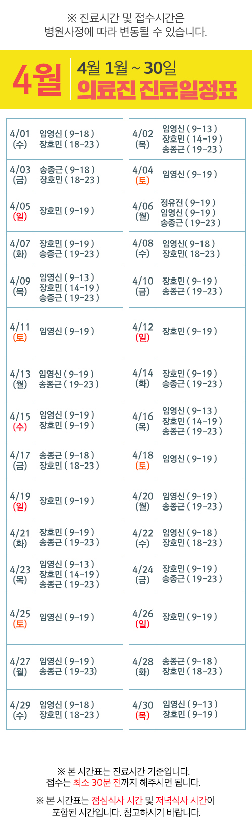 ※ 진료 의사 및 진료 시간은 병원사정에 따라 변동될 수 있습니다.