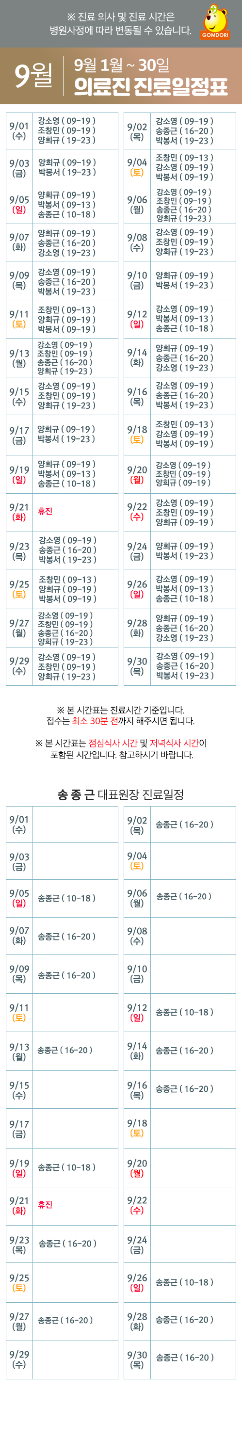 ※ 진료 의사 및 진료 시간은 병원사정에 따라 변동될 수 있습니다.