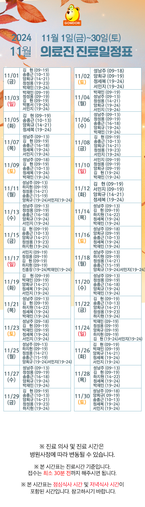 ※ 진료 의사 및 진료 시간은 병원사정에 따라 변동될 수 있습니다.