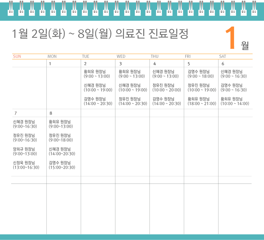 1월 2일(화)~8일(월)간 의료진 진료일정표를 확인해주시기 바랍니다.