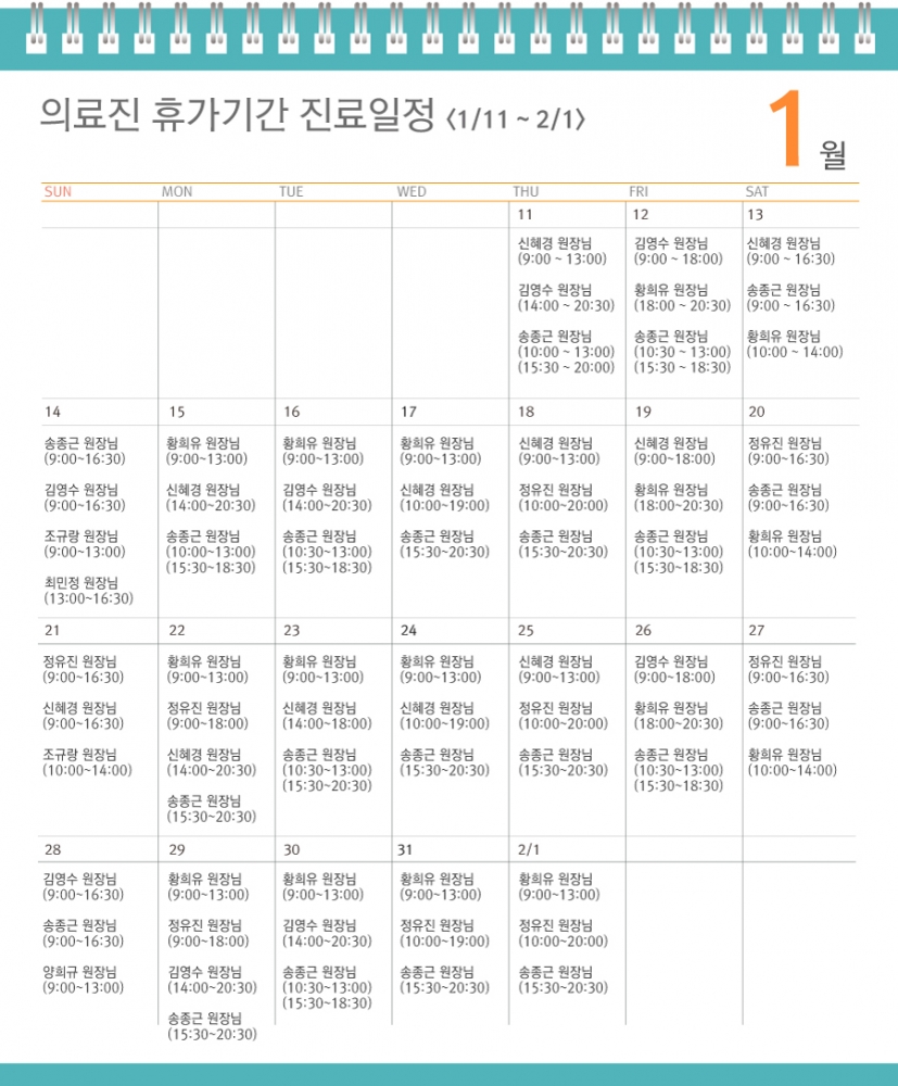 의료진 휴가일정으로 의료진별 진료일정이 변경되었습니다.